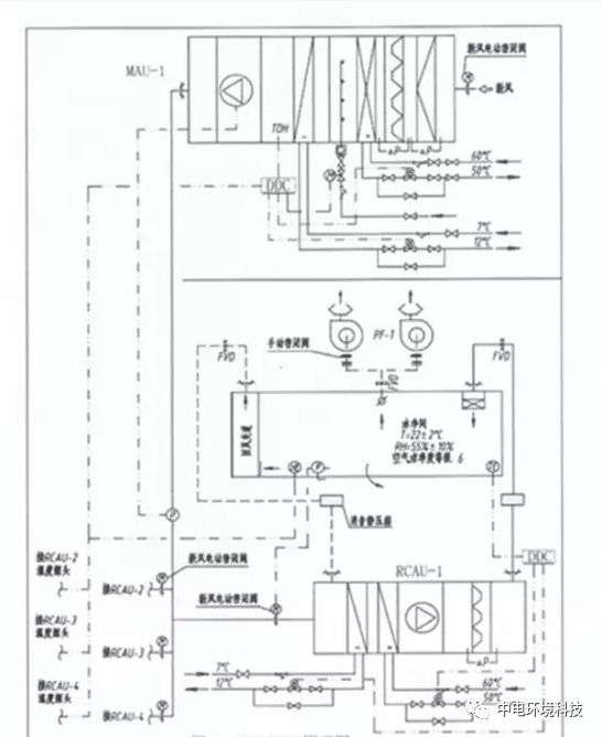 4.3净化生产车间的温度是由循环机组(RCAU)来保证的,经新风处理机处理后的空气状态为洁净房间的送风露点,新回风混合点一定在该洁净房间的热湿比线上,根据室内温度来调节表冷器和加热器回水管上的电动二通阀的开度。